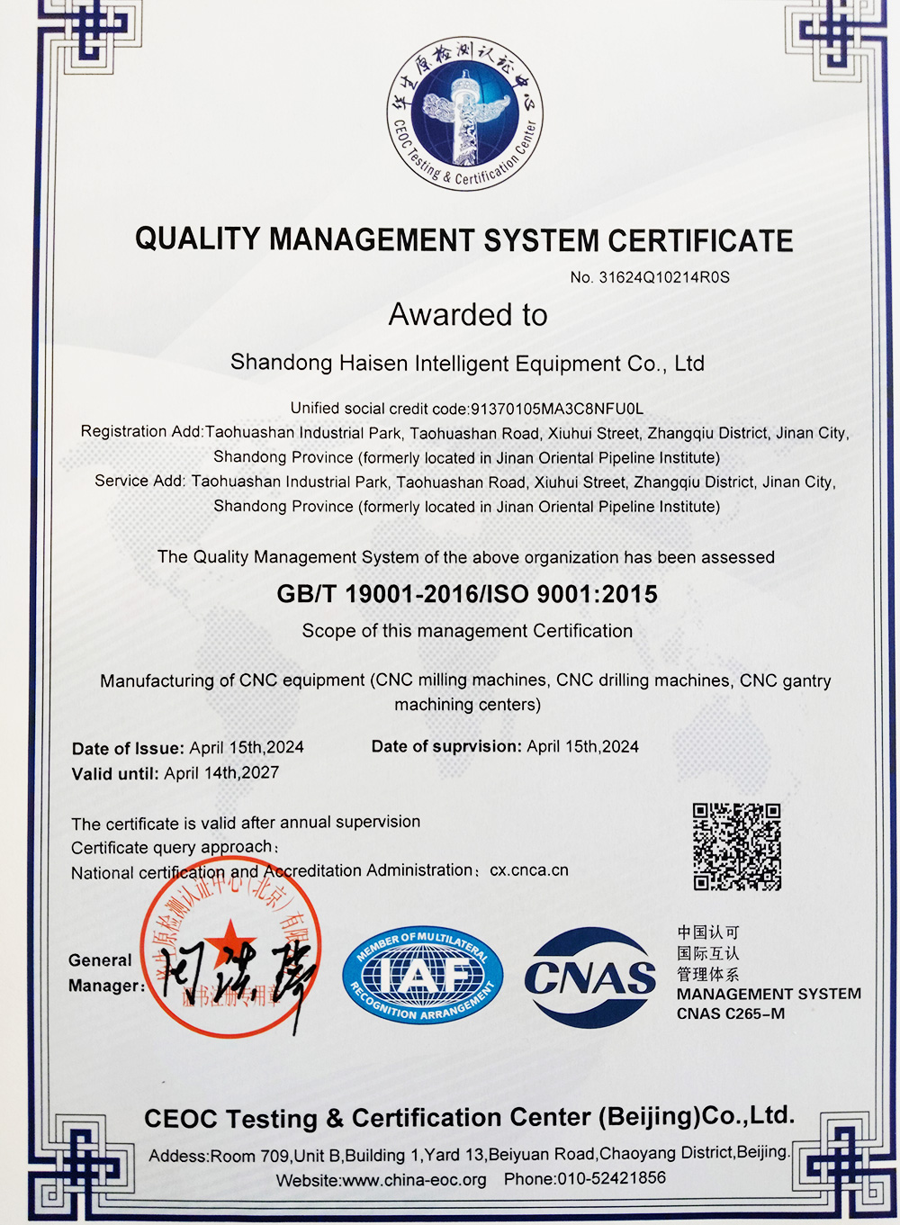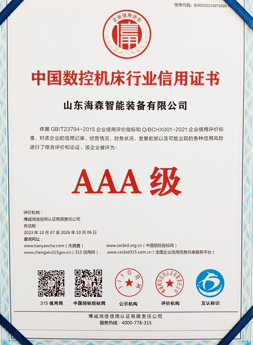 Shandong Haisen intelligent Equipment Co., Ltd. was established in April 2016, located in Jinan,the beautiful city of spring. lt is committed to the research and development, manufacturing andsales of CNC machinery, industrial intelligent equipment and other series products.The company adheres to the philosophy of 'people-oriented, pragmatic, and innovative.' Byattracting and nurturing talent, it has gradually gathered over 30 core technical professionals withprofessional expertise. The products have been certified under the national 1S09001-2008guality system and have obtained the export qualification for CNC machine tools. We arecommitted to strengthening our country through science and technology and revitalizing thenation through industry. We strive for excellence and perfection, and every day of our hard workbrings us closer to our goals. We look forward to a mutually beneficial partnership with you,growing together.